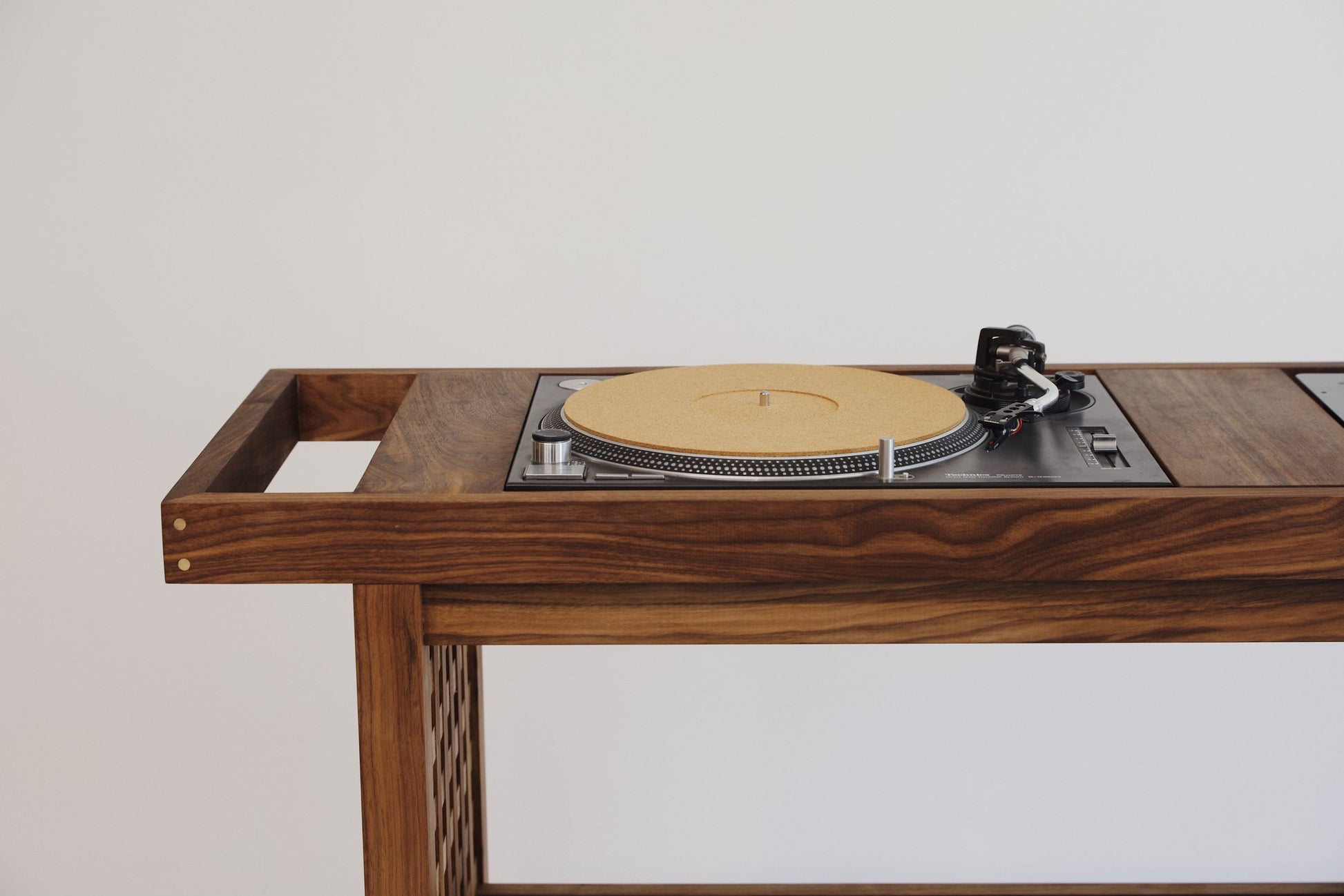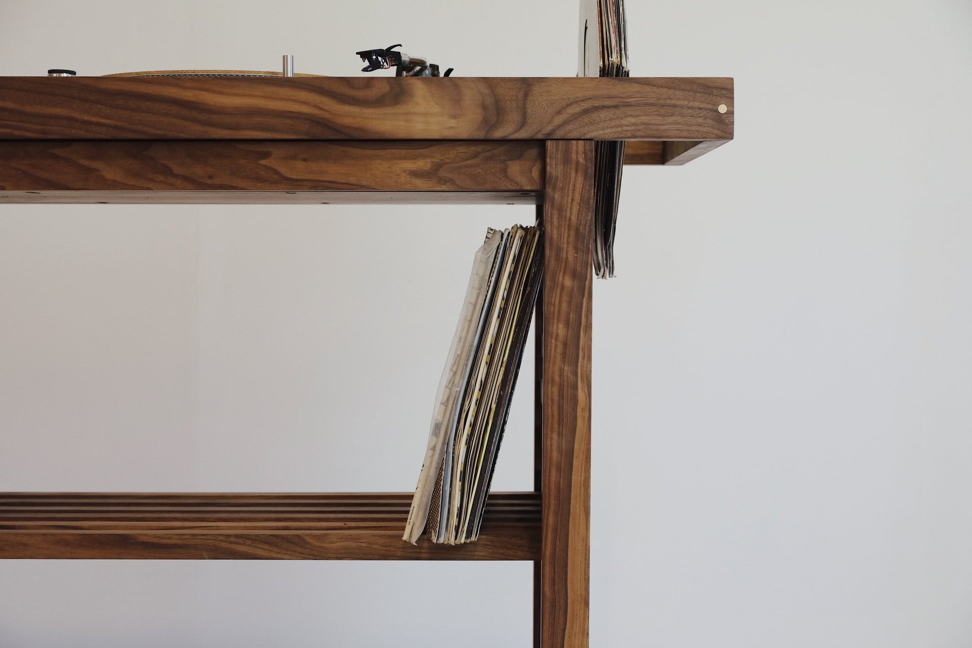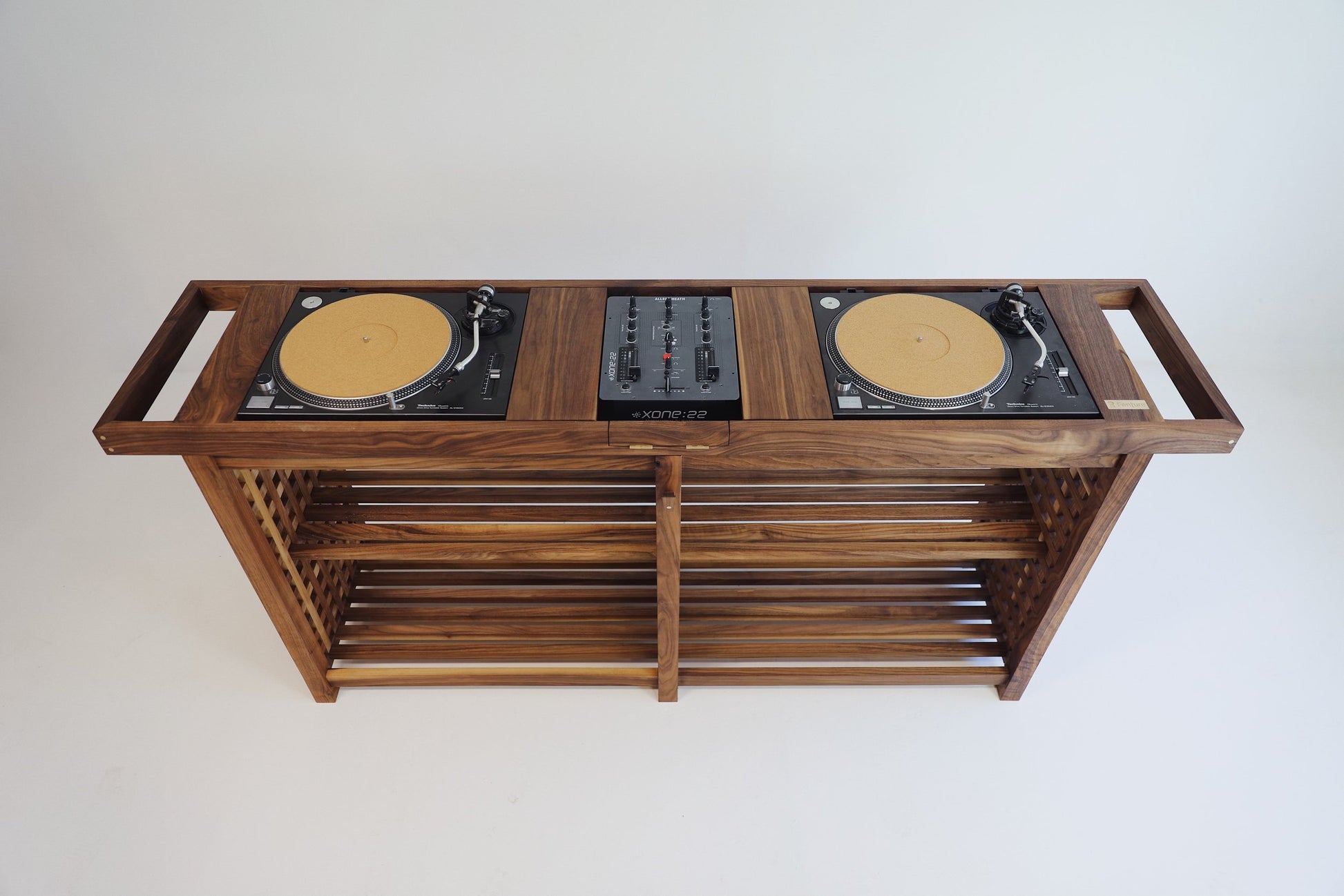 What can we say. This one is for the music lovers. Handmade in American Walnut this beauty has it all. Clean lines, secret storage and brass accents to bring it to life. Supplied with different size inserts to accommodate most mixer sizes. Alternatively send us required dimensions and we can have made to suit. Enough room underneath for a decent collection of records and additional storage either end for records you have already played. This is one of our favourite pieces.