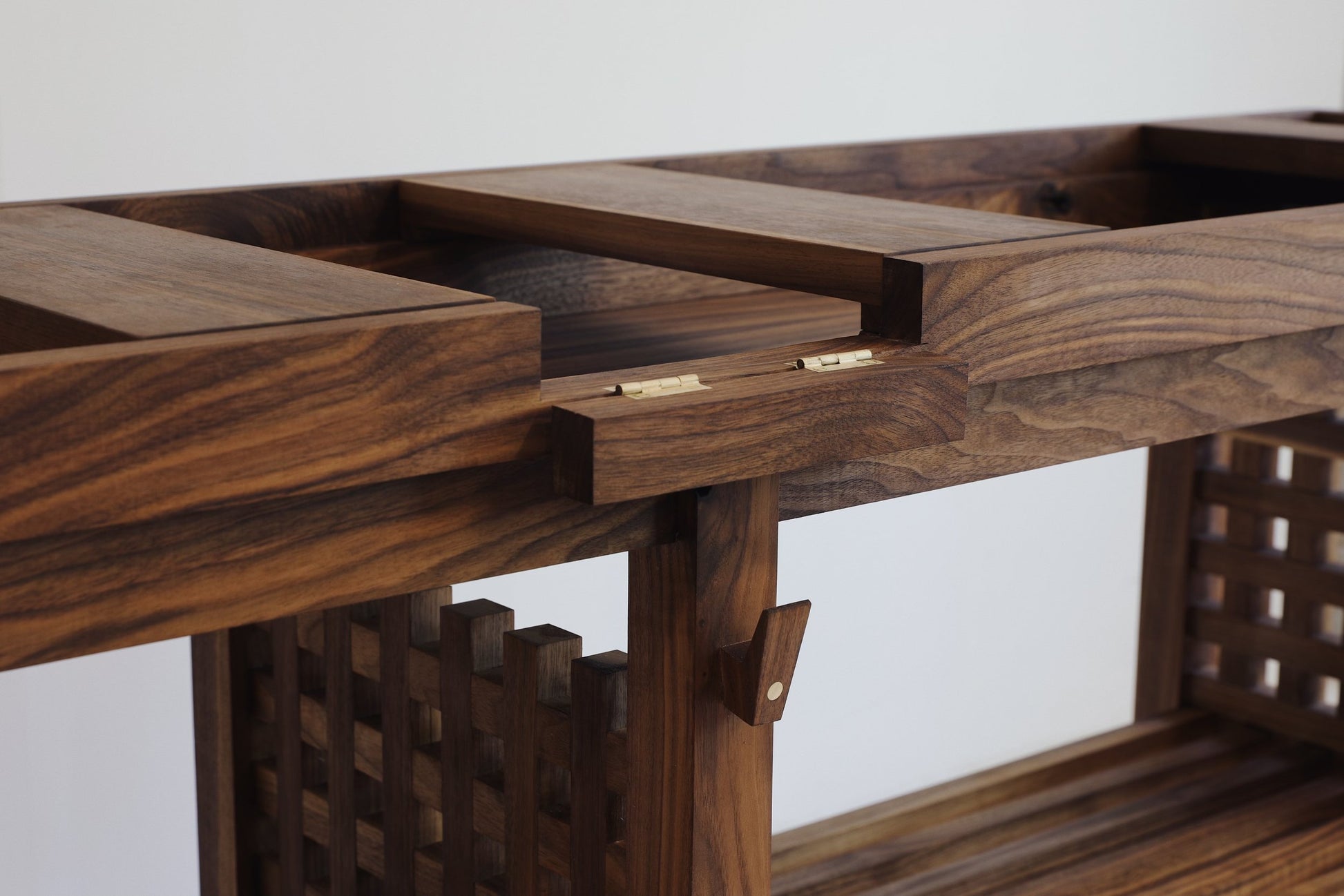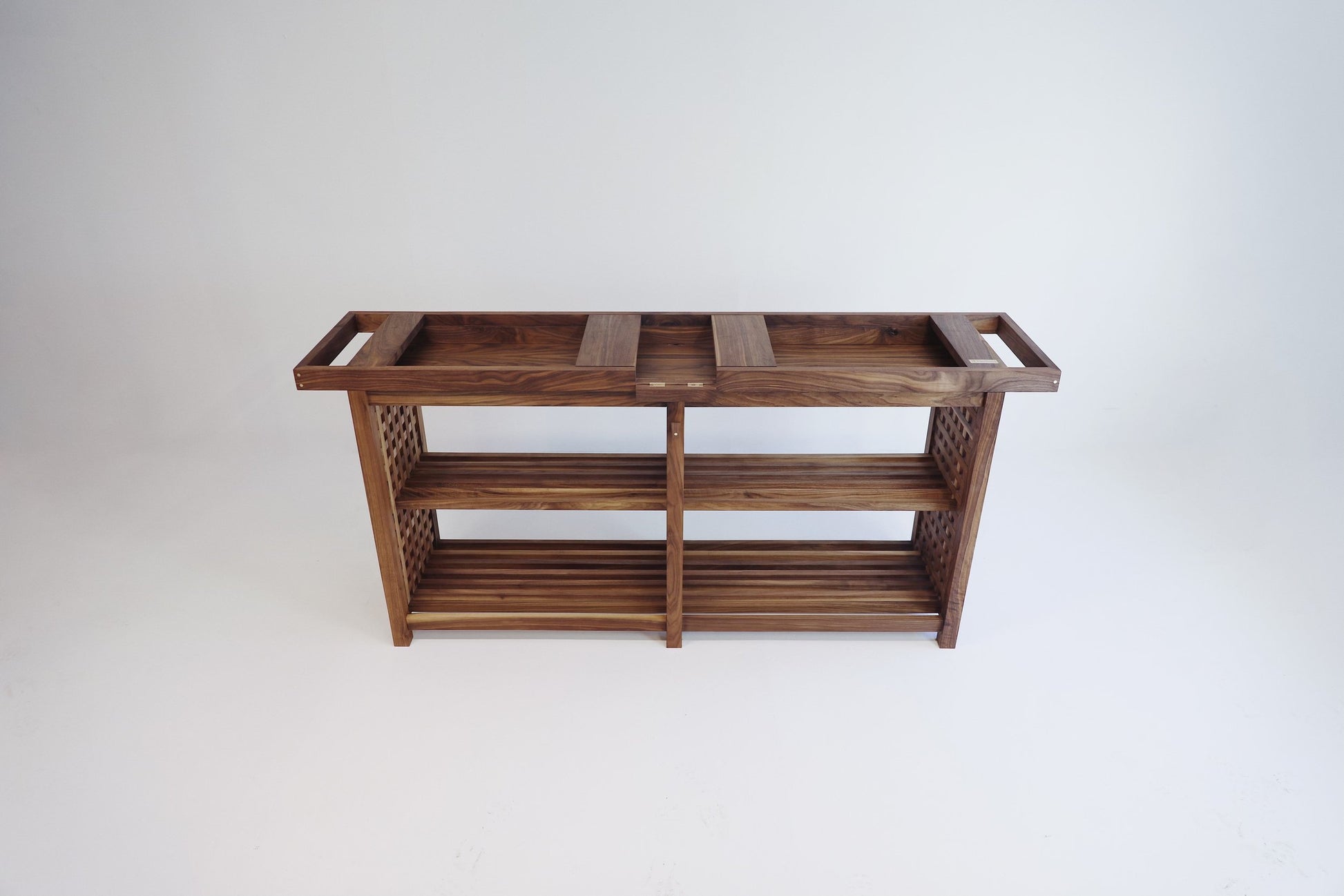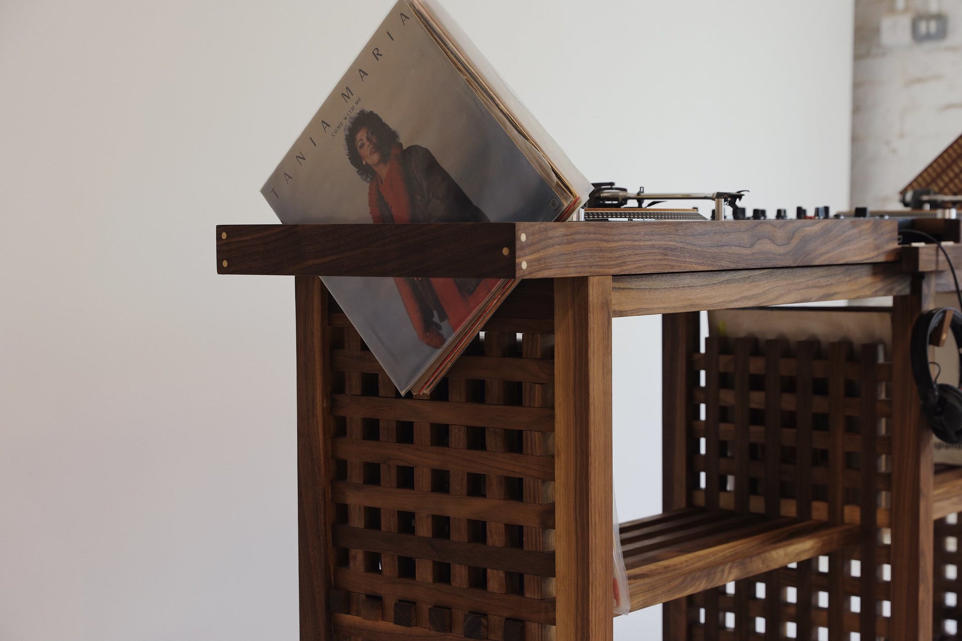 What can we say. This one is for the music lovers. Handmade in American Walnut this beauty has it all. Clean lines, secret storage and brass accents to bring it to life. Supplied with different size inserts to accommodate most mixer sizes. Alternatively send us required dimensions and we can have made to suit. Enough room underneath for a decent collection of records and additional storage either end for records you have already played. This is one of our favourite pieces.