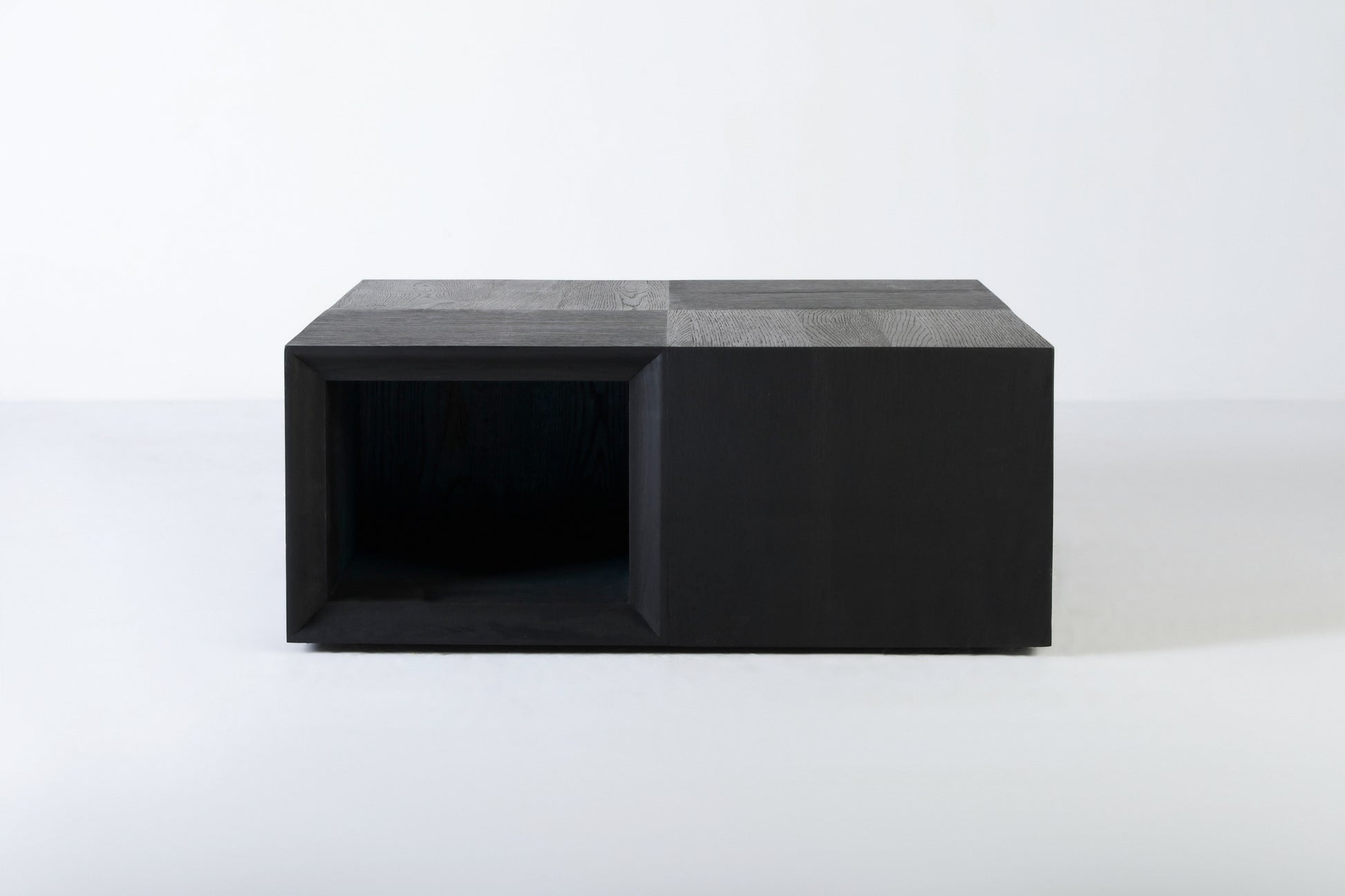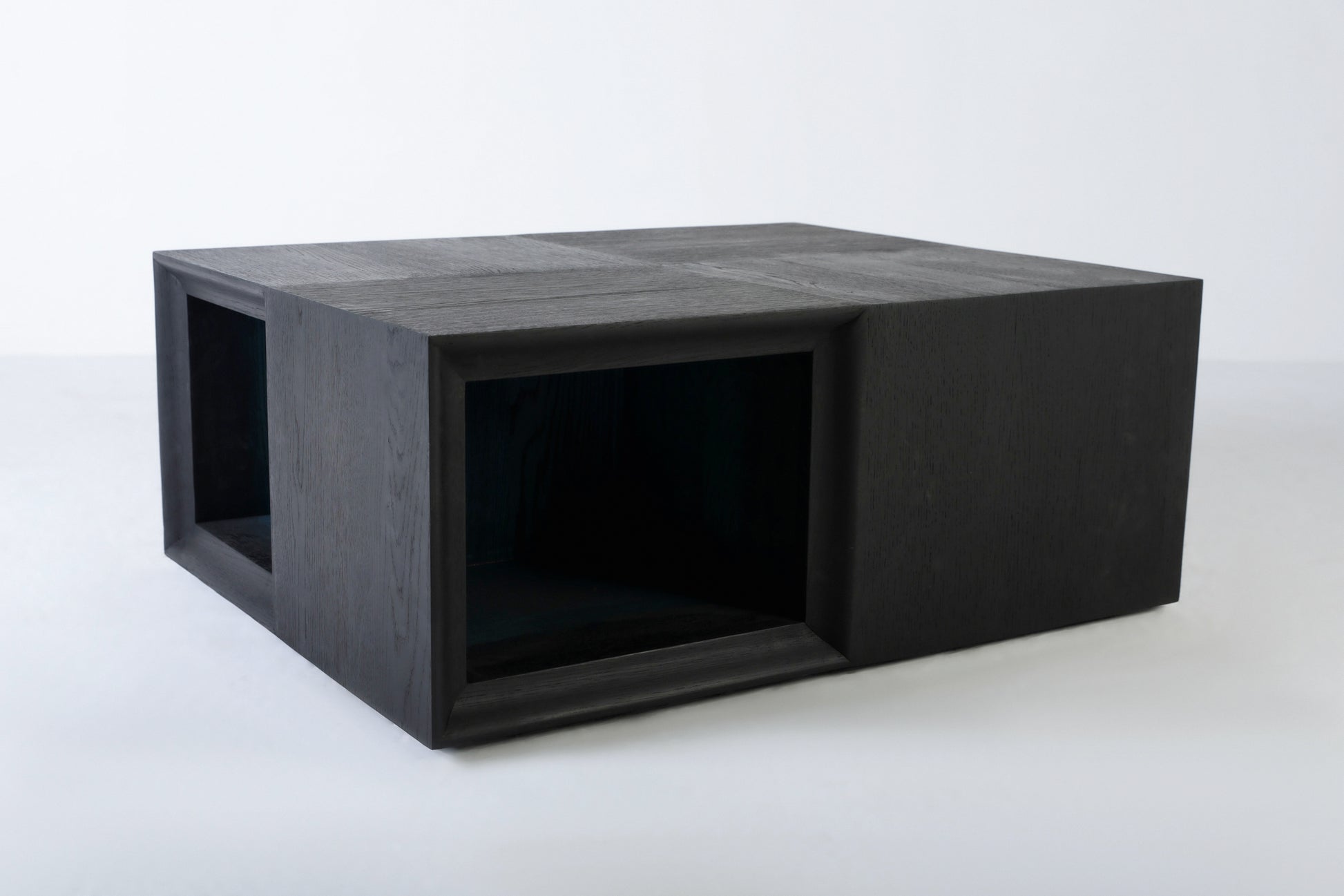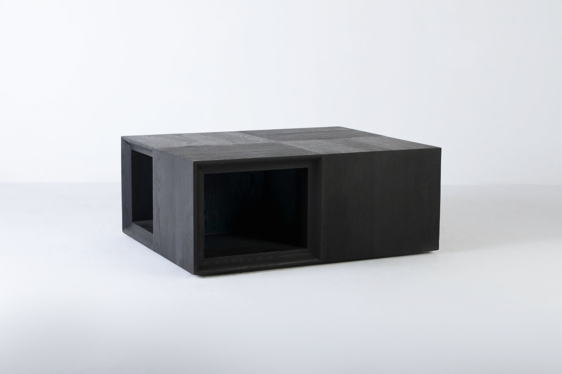 A stunning solid black oak coffee table, masterfully designed with a unique split into four sections. Each section serves as a functional space to hold books, creating both an artistic centrepiece and a practical storage solution.