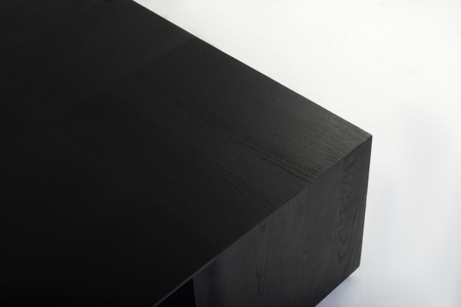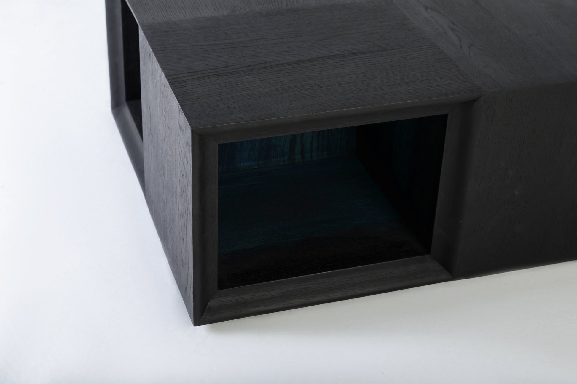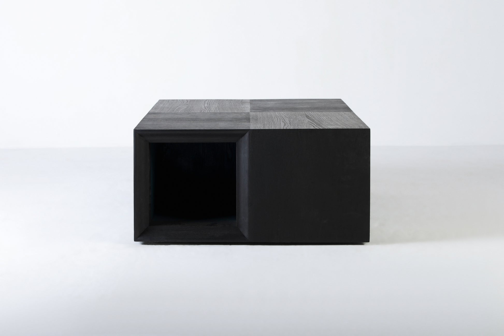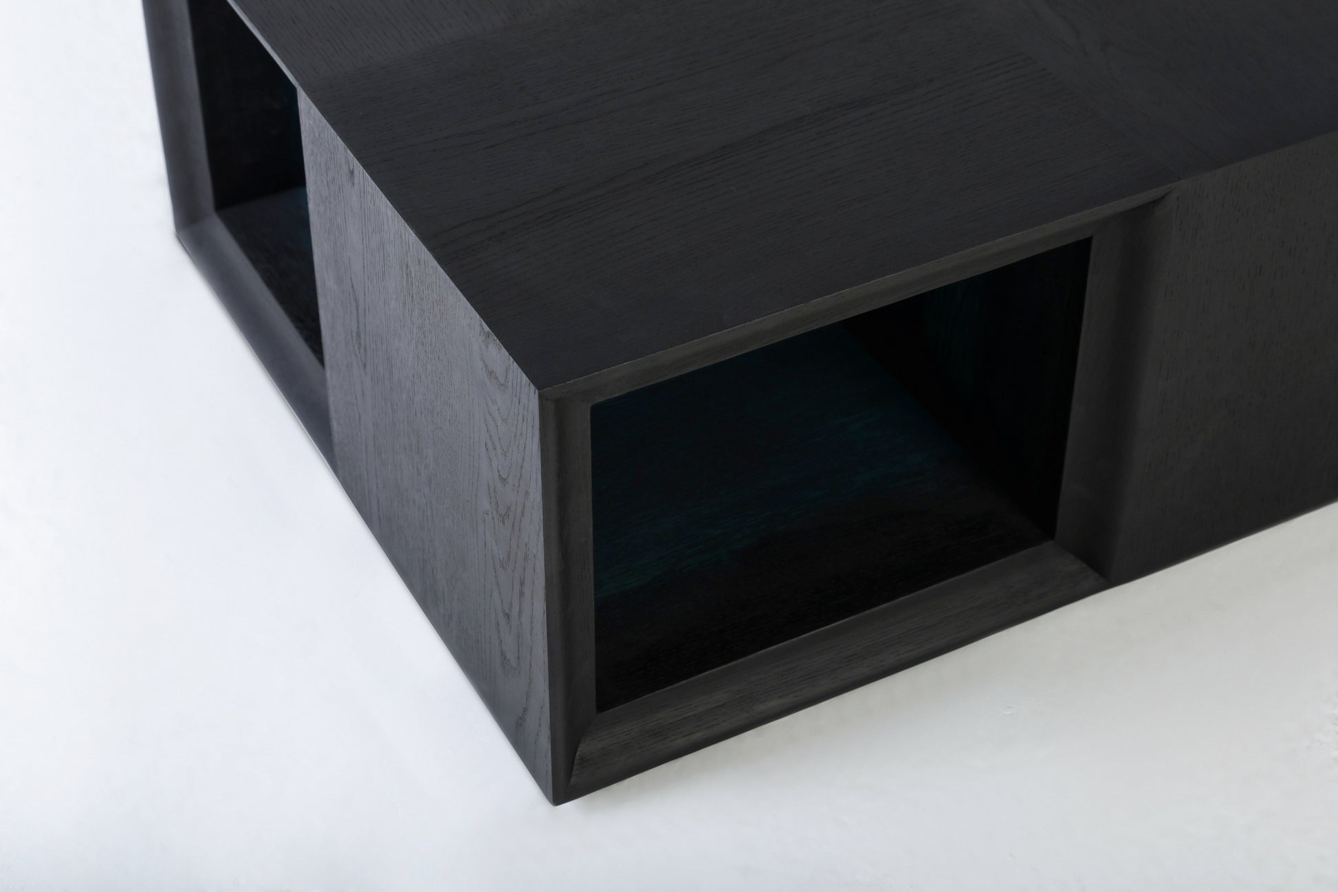 A stunning solid black oak coffee table, masterfully designed with a unique split into four sections. Each section serves as a functional space to hold books, creating both an artistic centrepiece and a practical storage solution.