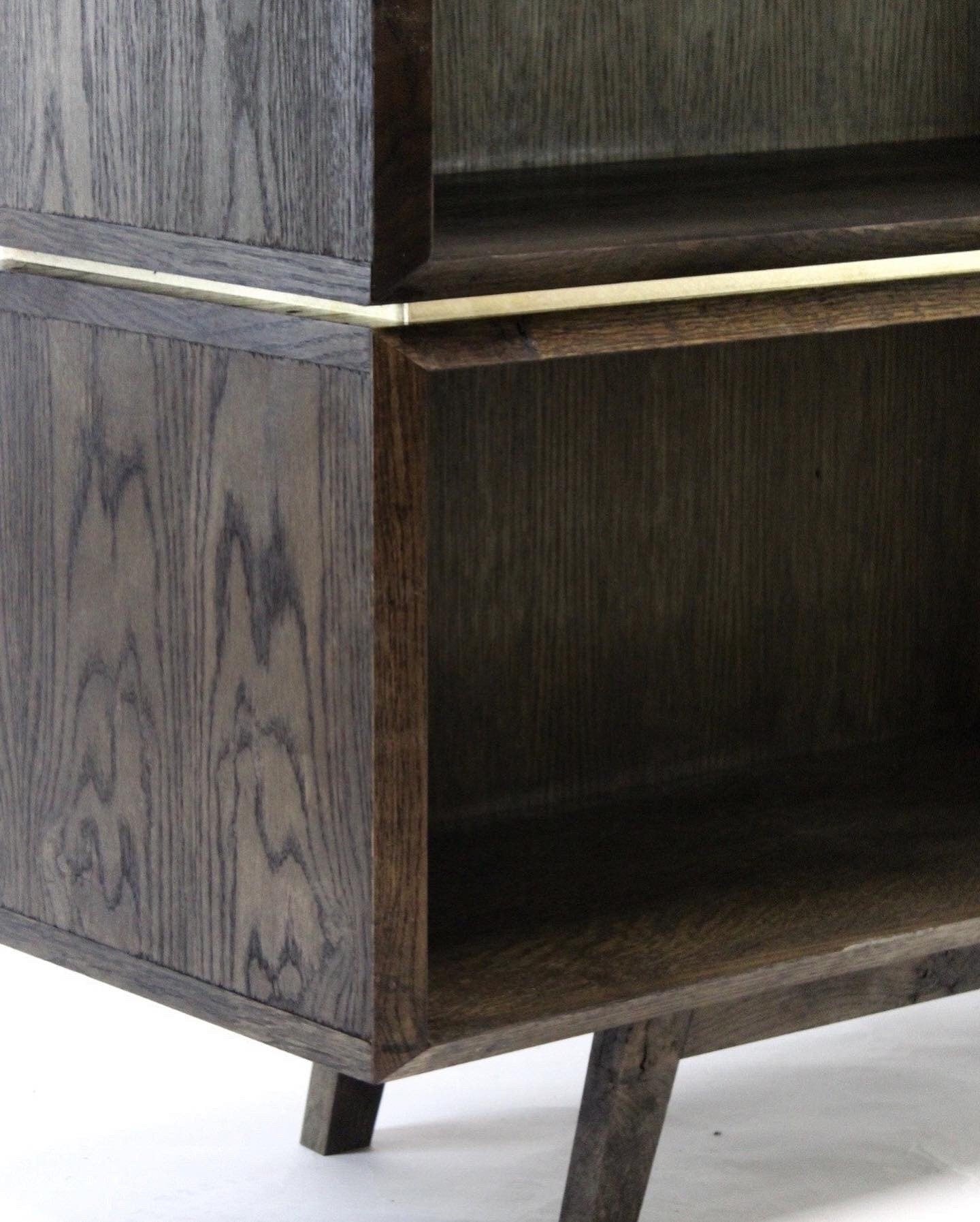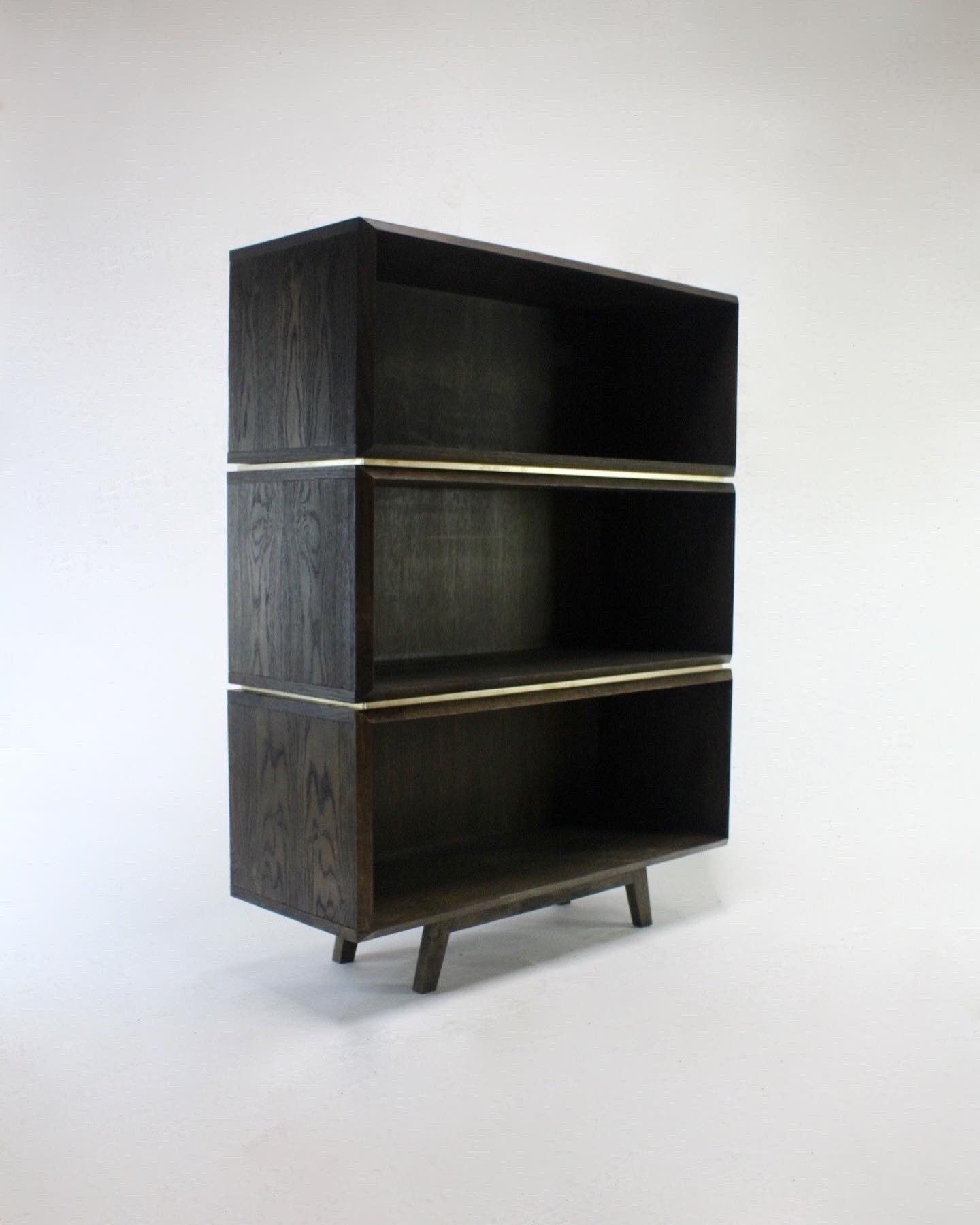 Burnt oak bookcase with brass dividers. Handmade in the UK. Can be made different dimensions. Shelf height 305mm Shelf width 800mm Overall height 980mm Overall width 840mm