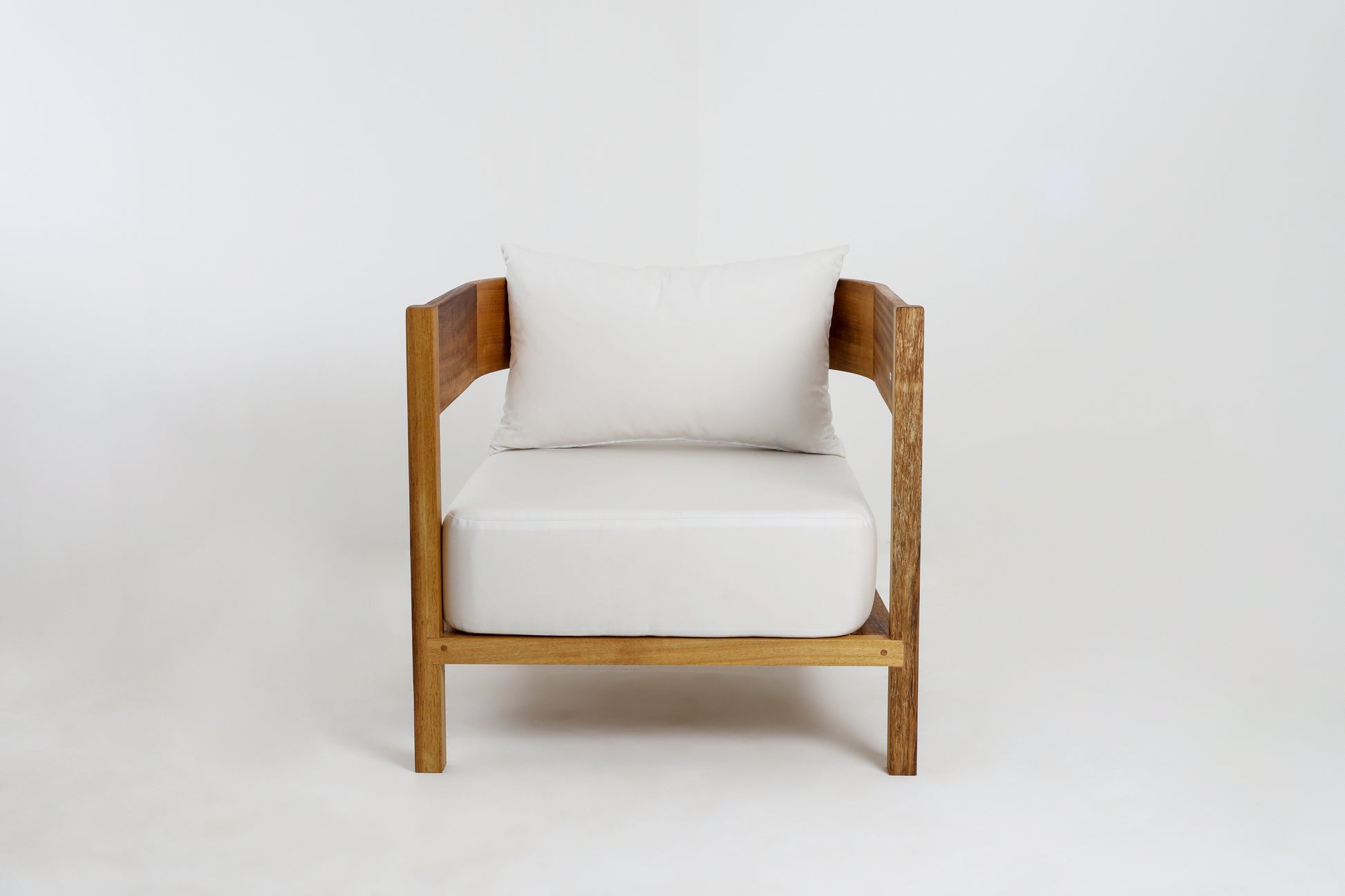 Handmade in Iroko so suitable for exterior use. Cushion thickness in 200mm so perfect for lounging the day away. overall depth 850mm seating height 400mm and width is 800mm