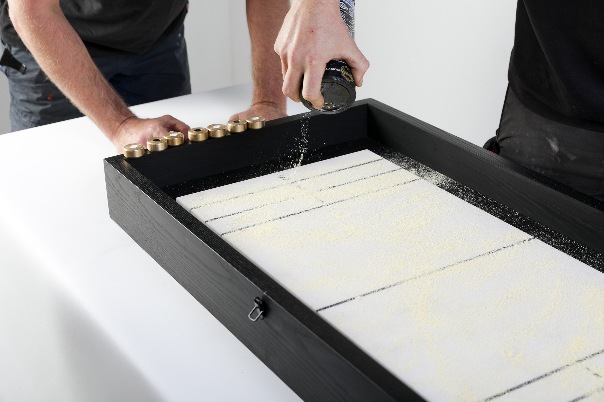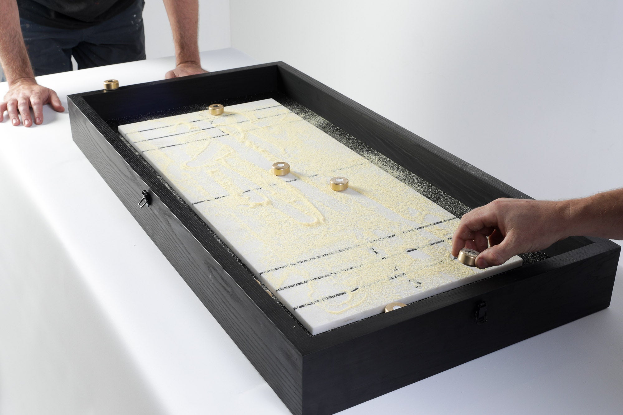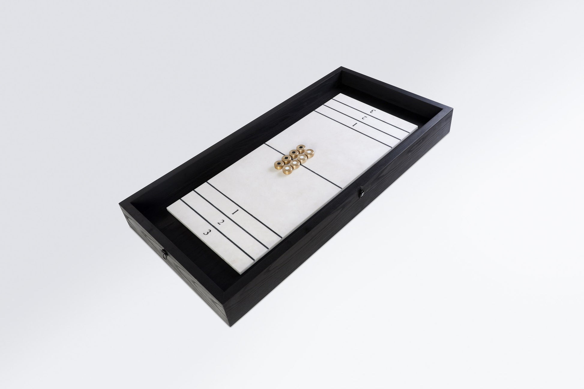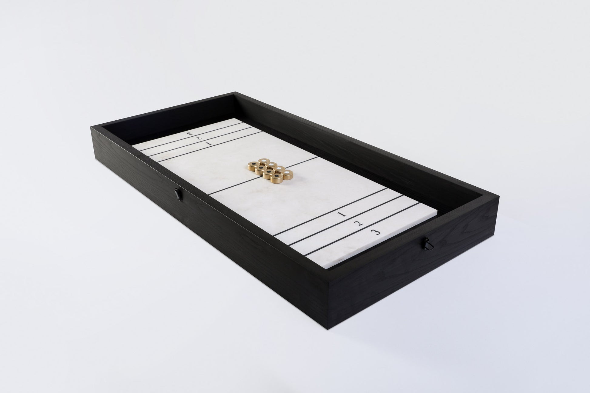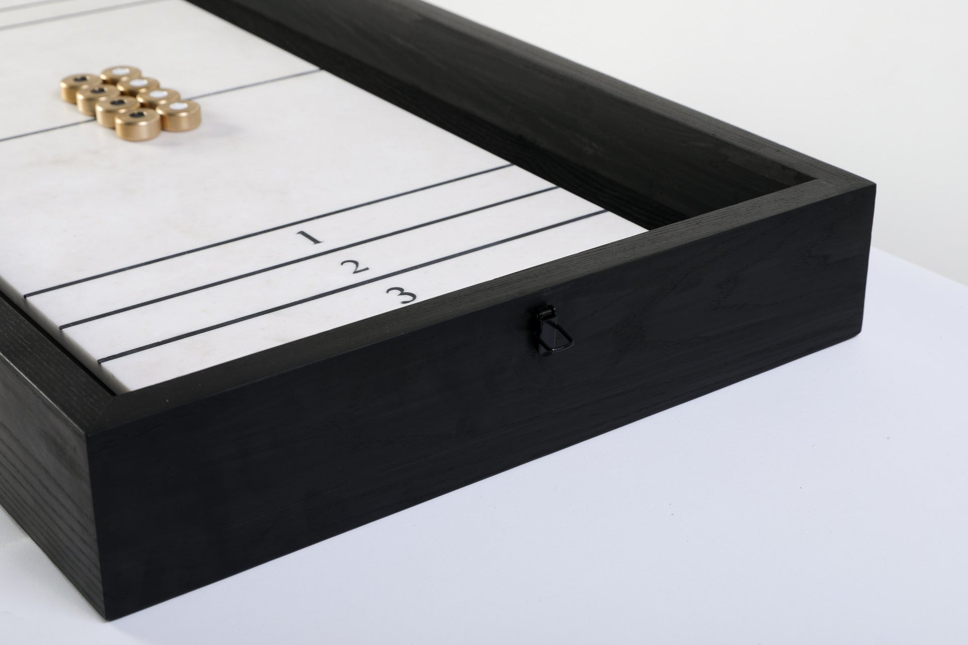 Introducing the Handmade Black Ash Mini Shuffleboard. This unique piece is crafted from premium black ash wood, solid surface, and solid brass, offering a stunning addition to any home, office, pub, or game room. The distinctive grain of black ash adds a rich, sophisticated touch, making each board truly one-of-a-kind. With its compact size, this mini shuffleboard is perfect for intimate spaces, allowing you to enjoy the classic game without needing a full-sized board