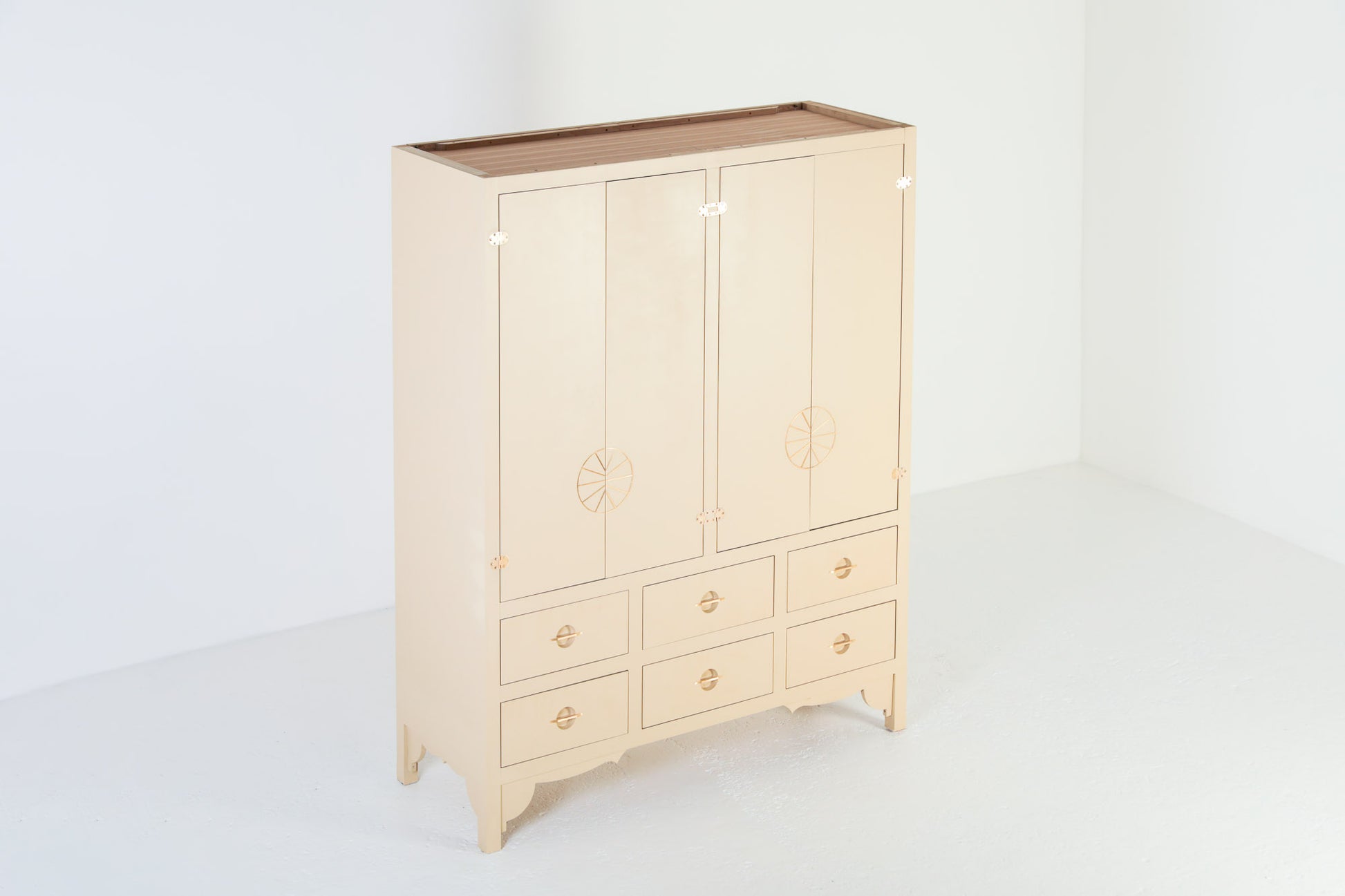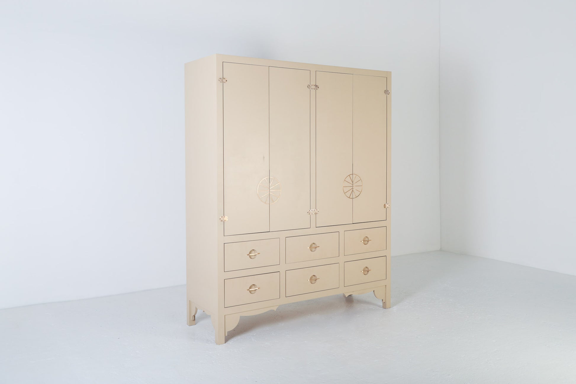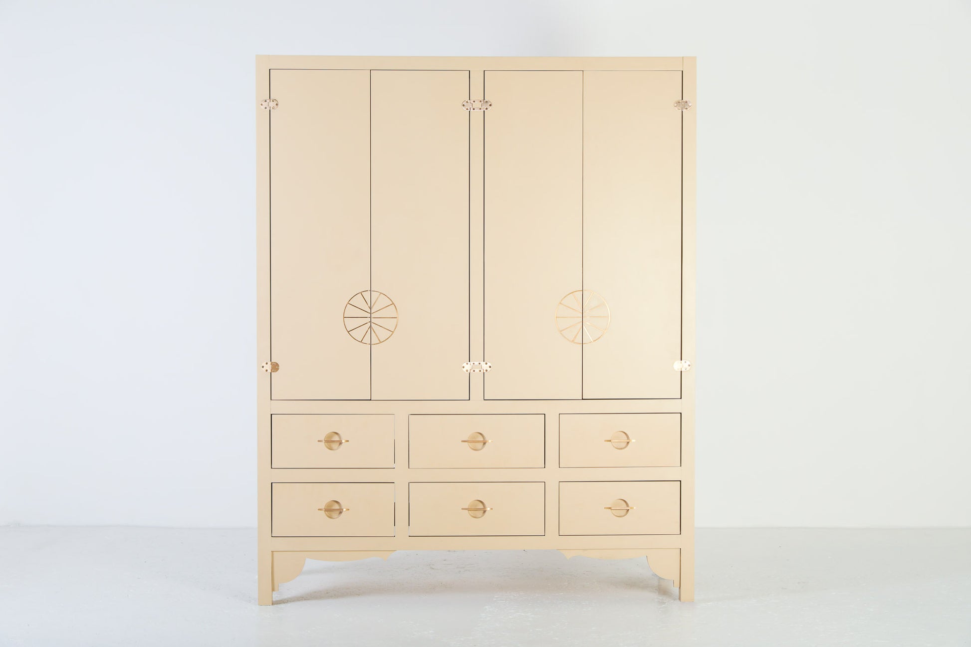 Introducing a wardrobe of unparalleled elegance: crafted from rich tulip and oak and accented with hand made brass details. Its free-standing design commands attention while blending seamlessly with any decor. With ample storage, it combines functionality with timeless beauty. Built to last a lifetime, this wardrobe is more than furniture—it's an investment in luxury and enduring style.